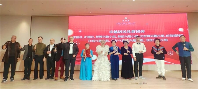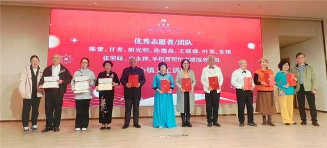 荣耀时刻,感恩奉献:致敬每一个闪光的社群与个人 过去一年的丰富多彩,离不开众多兴趣小组与志愿者的无私奉献。在激动人心的颁奖环节,九个卓越团体获得表彰:京剧社与沪剧社,一北一南,共同传承戏曲风华,分获“京韵风华奖”与“怡福沪韵奖”;桥牌社智趣非凡,荣获“智慧风采奖”;舞蹈队与交谊舞队舞步翩跹,共享“舞韵风华奖”;气排球队在球场挥洒汗水,夺得“乐活奋进奖”;时装模特队步履从容,展现“仪态风范奖”;合唱团用和美之声温暖家园,荣获“和美之声奖”;书法小组墨香润心,获得“翰墨匠心奖”。 此外,共有10余名优秀志愿者也获得隆重表彰,他们活跃在社区的每个角落,用无私的付出诠释了“奉献、友爱、互助、进步”的志愿精神,是小镇最温暖的底色。